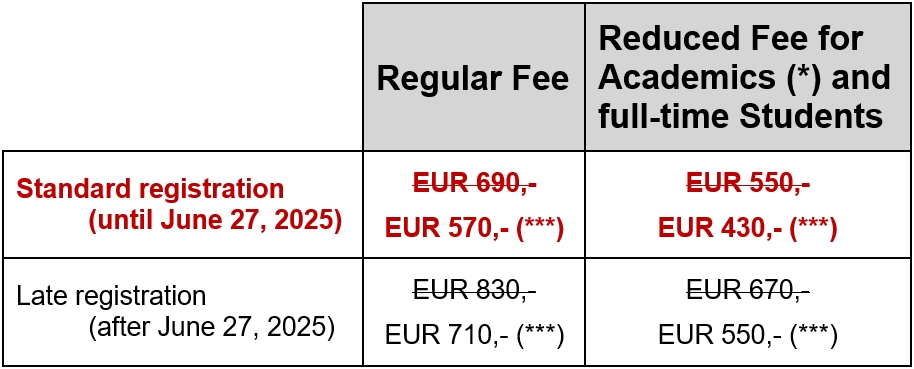 (***) 2025-06-01: Due to limited places at the Conference Dinner, registration from now on is without dinner - in this case EUR 120 will be saved.
